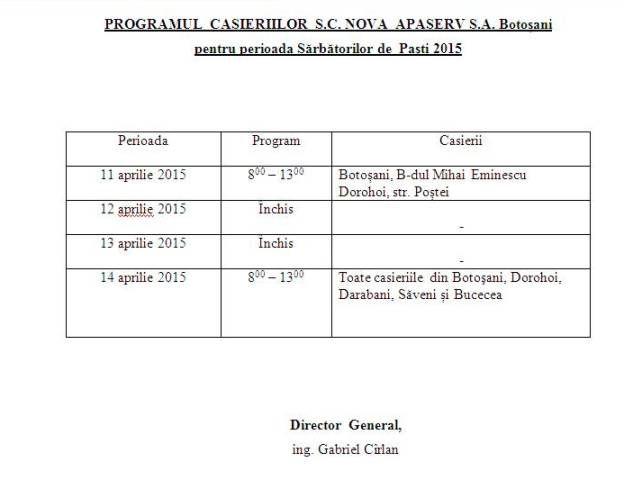 Conducerea societatii SC Nova Apaserv SA a facut public programul casieriilor in perioada Sarbatorilor de Pasti.