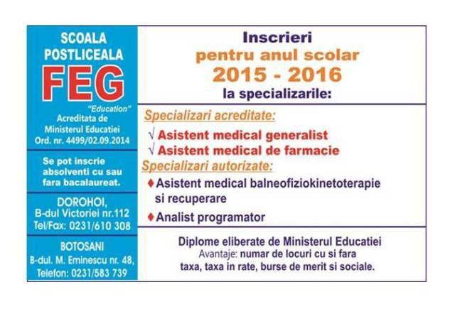 Școala Postliceală FEG „Education”, acreditată de Ministerul Educației Naționale, prin Ordinul nr. 4499/02.09.2014, îți oferă oportunități diverse pentru calificări în meseria de Asistent medical.