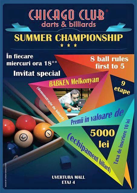 Uvertura Mall și Chicago Club Darts & Billiards invită toți amatorii și pasionații de bilird, la concursul Summer Championship. Concursul va fi în fiecare miercuri, începând cu orele 18:00 și va avea ca invitat special pe Babken Melkonyan care va face o demonstrații de biliard la nivel de competiție.