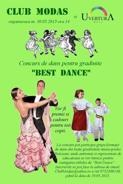 Uvertura Mall în colaborare cu Club Modas invită copii la un concurs de dans, sâmbătă, 30 mai 2015, începând cu ora 14:00, la etajul 4. Trupele de dansatori de la grădinițele antrenați și reprezentați de educatoare se vor întrece pentru câștigarea titlului de Best Dance.