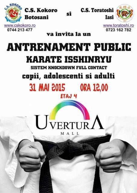 Duminică, 31 mai, începând cu ora 12:00, la etajul IV al Uvertura Mall Botoșani, botoșănenii sunt invitați să vizioneze și să participe la antrenamentul public a stilului de karate Isshinryu.