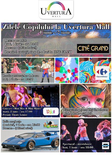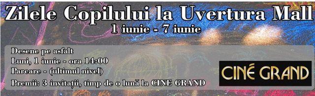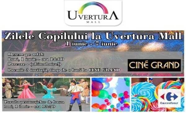 Desene pe asfalt: De Ziua Copilului, Uvertura Mall, Asociația Poezia Muzicii și Asociația Culturala Fioravante invită toți copii la distracție și voie bună, începând cu ora 14:00, la ultimul etaj al parcării. Cele mai frumoase desene vor fi premiate cu vouchere la: Cine Grand Romania și Noriel.