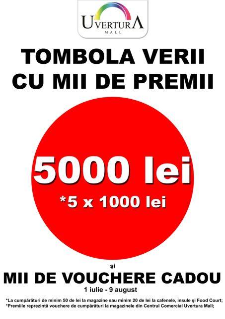 Se vor oferi premii în valoare totală de peste 50.000 de lei. La Tombolă pot participa toţi clienţii care fac cumpărături în valoare de 20 de lei ori de 50 de lei în perioada campaniei. Taloanele vor fi oferite la magazinele Uvertura Mall în această perioadă iar extragerea se va face pe data de 10 iulie 2015.