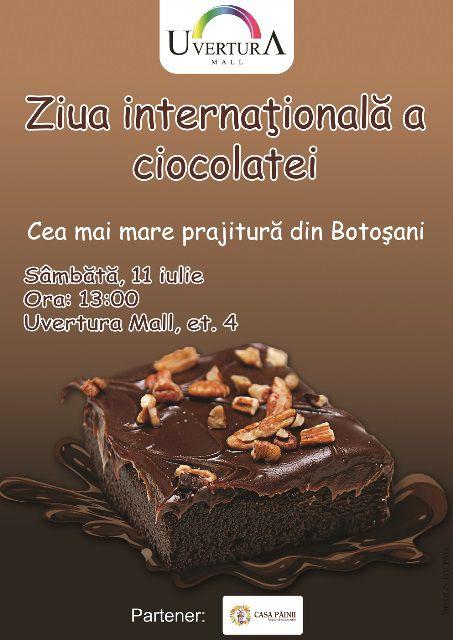 Pentru a celebra Ziua Internaţională a Ciocolatei, Uvertura Mall va expune cea mai mare prajitura de ciocolată făcută vreodată în Botoşani. Prăjitura va avea 2 metri pătraţi şi este creată în colaborare cu „Casa pâinii”, care oferă în fiecare zi produse proaspete de patiserie vizitatorilor Uvertura Mall.