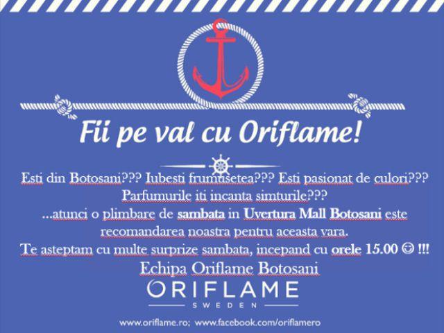 De la ora 12:00 acestea sunt invitate să afle ce surprize le oferă Oriflame. Aceştia sunt pregătiţi să le răsfeţe simţurile prin culoare şi parfum la etajul 3 al Uvertura Mall.