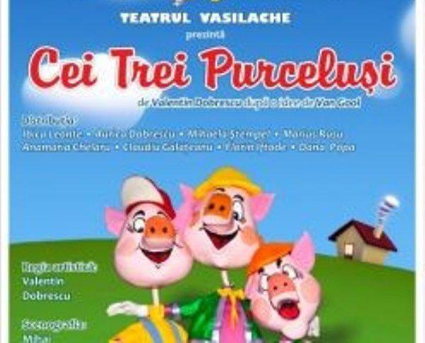 Duminică, 27 septembrie 2015, vă invităm la Teatrul pentru Copii şi Tineret „Vasilache”, să vizionaţi, de la orele 11:00 şi 12:30, spectacolul „Cei trei purceluşi”, o poveste îndrăgită de copii şi transpusă în scenă de regizorul Valentin Dobrescu, după o idee de Van Gool.