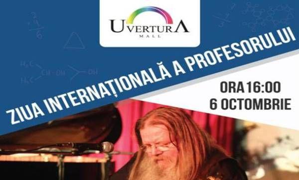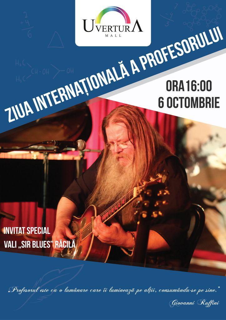 Duminică, 4 octombrie începând cu ora 16:00, la etajul 4 al Centrului Comercial sunt așteptate toate cadrele didactice, pentru a sărbători și recunoaște meritele muncii lor, dar și toți cei ce vor dori să se bucure de acordurile muzicii invitatului special Vali ”Sir Blues” Răcilă, care va concerta timp de 60 de minute.