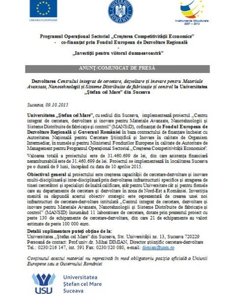 Universitatea „Ștefan cel Mare”, cu sediul din Suceava,  implementează proiectul „Centru integrat de cercetare, dezvoltare și inovare pentru Materiale Avansate, Nanotehnologii și Sisteme Distribuite de fabricație și control” (MANSiD), cofinanțat de Fondul European de Dezvoltare Regională și Guvernul României în baza contractului de finanțare încheiat cu Autoritatea Națională pentru Cercetare Științifică și Inovare în calitate de Organism Intermediar, în numele și pentru Ministerul Fondurilor Europene în calitate de Autoritate de Management pentru Programul Operațional Sectorial „Creșterea Competitivității Economice”.