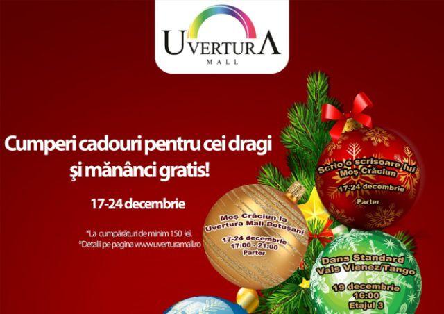 La Uvertura Mall, colindele vor răsuna întregul week-end, spre încântarea clienţilor aflaţi în căutarea darurilor de Crăciun. Atmosfera de sărbătoare  va fi întreținută de poveștile muzicale de Crăciun, de tradițiile și obiceiurile specifice sărbătorilor de iarnă, oferite de zeci de grupuri și ansambluri din Botoșani, care vor împarți cele mai calde urări de bine auditoriului.