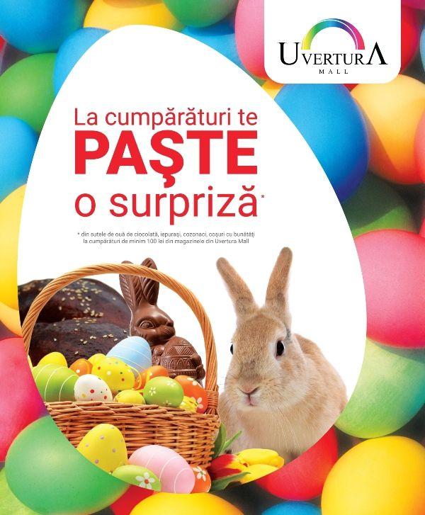 Vă așteaptă figurine delicioase de ciocolată, cozonaci gustoși și coșuri cu bunătăți dacă alegeți să faceți cumpărăturile la Uvertura. Prezentați-vă la punctul de premiere de la parter cu un bon de cumpărături de minim 100 lei. Campania este valabilă în perioada 24-30 aprilie, în limita stocului disponibil.
