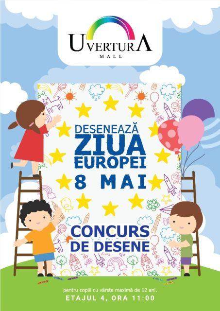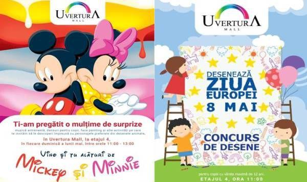 Mai mult decât atât, duminica aceasta, Mickey și Minnie invită toți copiii la Concursul de desene a cărui tematică este „Ziua Europei”. Competiția este deschisă contribuțiilor individuale ale copiilor cu vârsta de maxim 12 ani, care sunt predate către Mickey și Minnie, tot duminică, între orele 11:00-13:00. Desenele vor fi postate pe pagina de Facebook Uvertura, iar cele care strâng cel mai mare număr de like-uri până pe data de 9 mai, ora 12:00 vor fi premiate cu: locul 1- 150 lei, locul 2-100 lei, locul 3-50 lei. Sunt acceptate doar desene în format A4 realizate prin orice tehnică compoziţională: ulei, acuarelă, creion, peniţă, colaj, ceracolor etc.