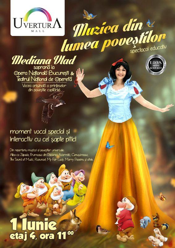 De la ora 11, la etajul 4, în zona Food Court, vă invităm să pășiți într-o lume de poveste împreună cu Albă ca Zăpada și cei 7 pitici, care au pregătit un spectacol interactiv intitulat „Muzica din lumea poveștilor”. Momentul vocal special este susținut de Mediana Vlad, soprană la Opera Națională București, Teatrul Național de Operetăși vocea originală a prințeselor din poveștile copilăriei.