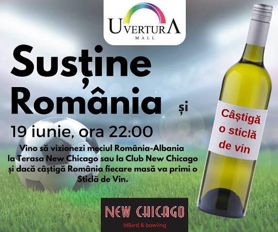 Duminică seară, suntem alături de toți suporterii României, la meciul din Campionatul European începând cu orele 22:00. Cei care aleg să urmărească meciul la Cafeneaua sau Clubul New Chicago, din Uvertura Mall, de la etajul 4, au șansa să primească o sticlă de vin, dacă echipa României iese învingătoare din meciul cu Albania. Hai România!