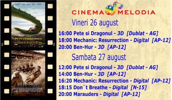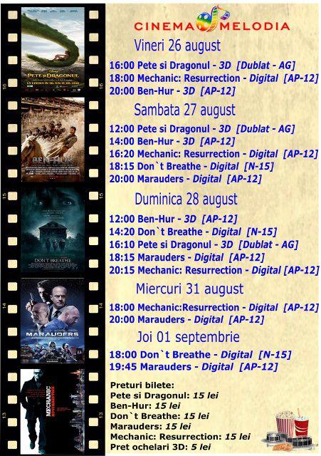Filme de acţiune, animaţie, istoric dar şi horror, este oferta cu care Cinematograful Melodia vine în această săptămână. Toate producţiile sunt oferite în premieră fiind lansate de curând în cinematografe. Biletele pot fi rezervate la numărul de telefon: 0729.000.094