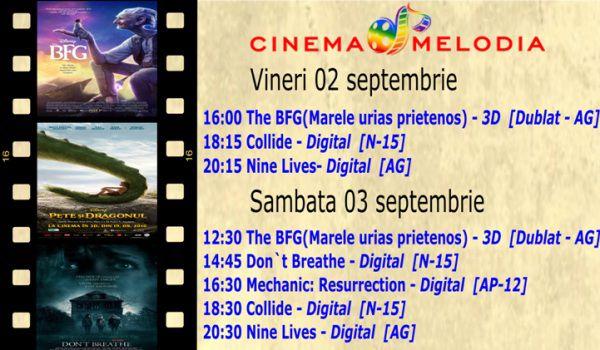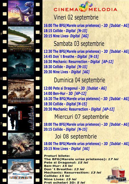 Filme de acţiune, animaţie, istoric dar şi thriller, este oferta cu care Cinematograful Melodia vine în această săptămână. Toate producţiile sunt oferite în premieră fiind lansate de curând în cinematografe. Biletele pot fi rezervate la numărul de telefon: 0729.000.094