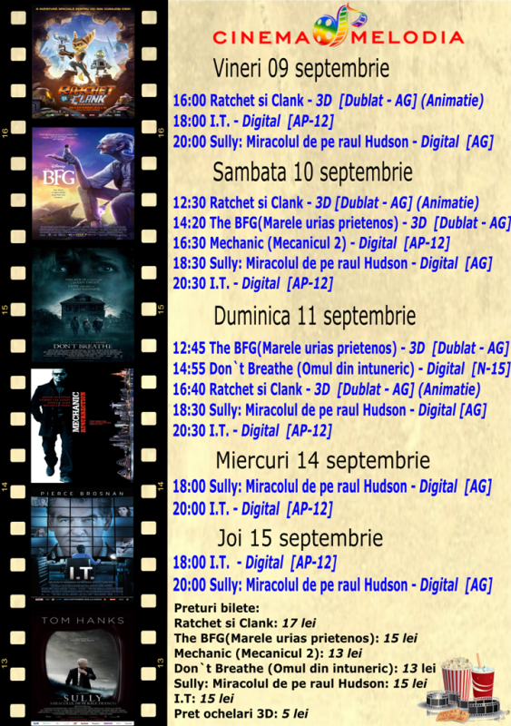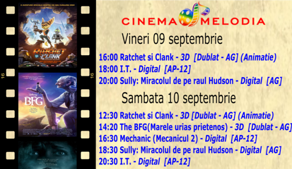 Filme de acţiune, animaţie, actiune dar şi thriller, este oferta cu care Cinematograful Melodia vine în această săptămână. Biletele pot fi rezervate la numărul de telefon: 0729.000.094