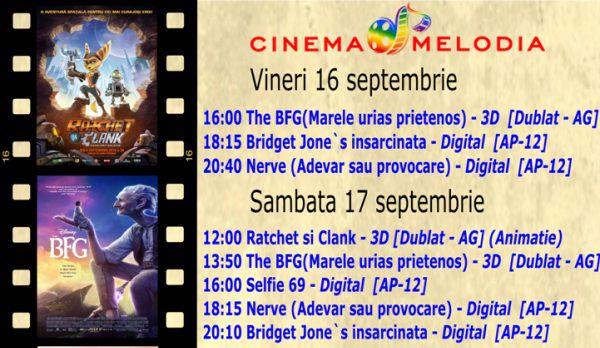 Filme de acţiune, animaţie, actiune dar şi thriller, este oferta cu care Cinematograful Melodia vine în această săptămână. Biletele pot fi rezervate la numărul de telefon: 0729.000.094