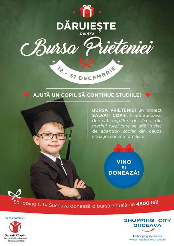 În perioada 12 - 31 decembrie, Shopping City Suceava în colaborare cu Salvați Copiii Filiala Suceava organizează campania umanitară „Dăruiește pentru Bursa Prieteniei!”, cu scopul de a aduna fonduri pentru copiii de liceu din mediul rural, care se află în risc de abandon școlar din cauza situației sociale familiale.
