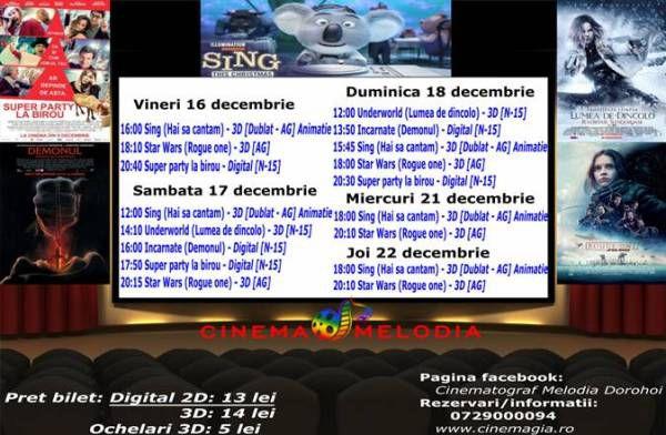 Filme de acţiune, animaţie, actiune dar şi thriller, este oferta cu care Cinematograful Melodia vine în această săptămână. Biletele pot fi rezervate la numărul de telefon: 0729.000.094