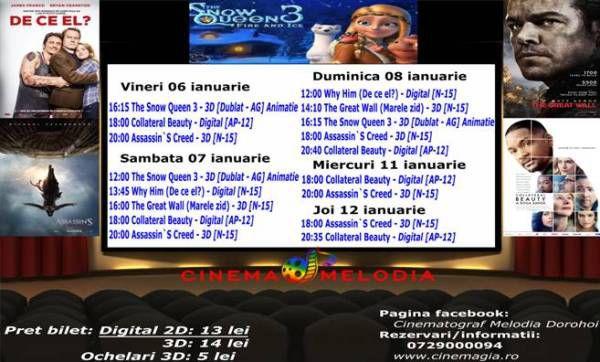 Filme de acţiune, animaţie, actiune dar şi thriller, este oferta cu care Cinematograful Melodia vine în această săptămână. Biletele pot fi rezervate la numărul de telefon: 0729.000.094