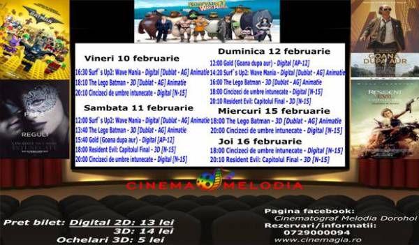 Filme de acţiune, animaţie, actiune dar şi thriller, este oferta cu care Cinematograful Melodia vine în această săptămână. Biletele pot fi rezervate la numărul de telefon: 0729.000.094