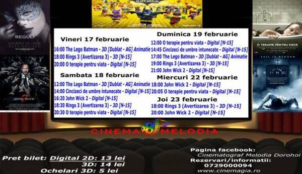 Filme de acţiune, animaţie, actiune dar şi thriller, este oferta cu care Cinematograful Melodia vine în această săptămână. Biletele pot fi rezervate la numărul de telefon: 0729.000.094