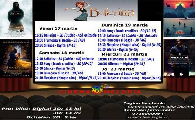 Filme de acţiune, animaţie, actiune dar şi thriller, este oferta cu care Cinematograful Melodia vine în această săptămână. Biletele pot fi rezervate la numărul de telefon: 0729.000.094