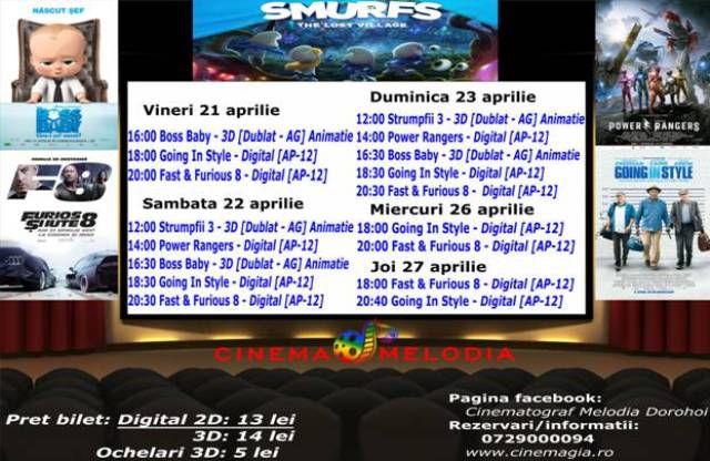 Filme de acţiune, animaţie, actiune dar şi thriller, este oferta cu care Cinematograful Melodia vine în această săptămână. Biletele pot fi rezervate la numărul de telefon: 0729.000.094