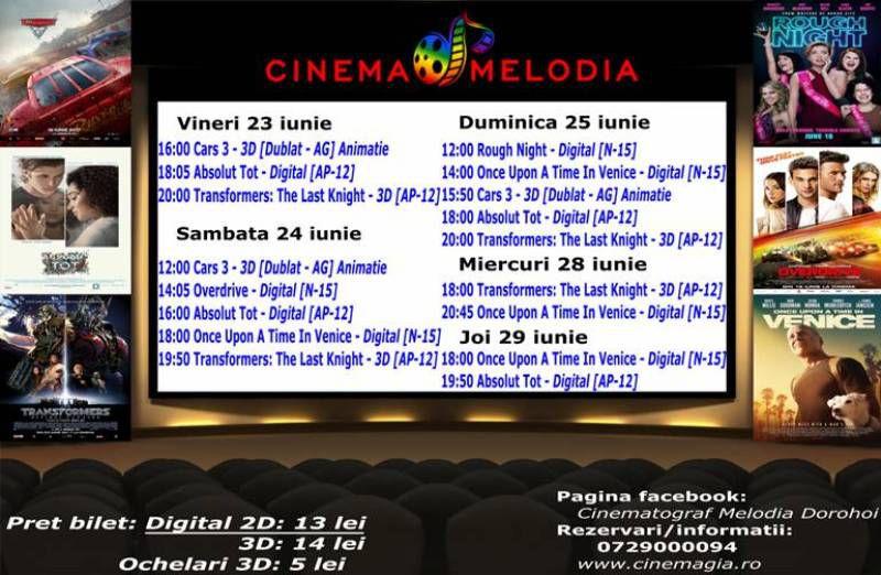 Filme de acţiune, animaţie, actiune dar şi thriller, este oferta cu care Cinematograful Melodia vine în această săptămână. Biletele pot fi rezervate la numărul de telefon: 0729.000.094