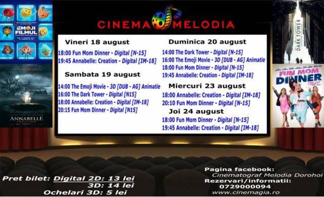 Filme de acţiune, animaţie, actiune dar şi thriller, este oferta cu care Cinematograful Melodia vine în această săptămână. Biletele pot fi rezervate la numărul de telefon: 0729.000.094