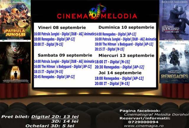 Filme de acţiune, animaţie, actiune dar şi thriller, este oferta cu care Cinematograful Melodia vine în această săptămână. Biletele pot fi rezervate la numărul de telefon: 0729.000.094.
