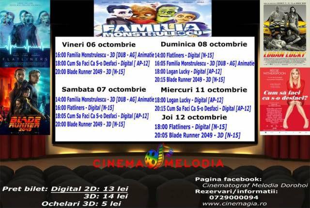 Filme de acţiune, animaţie, actiune dar şi thriller, este oferta cu care Cinematograful Melodia vine în această săptămână. Biletele pot fi rezervate la numărul de telefon: 0729.000.094.