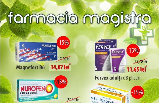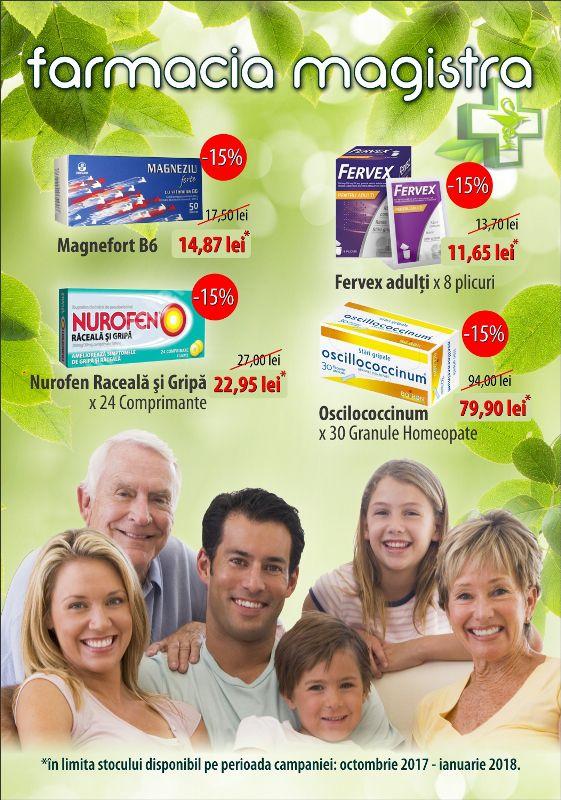 Farmaciile Magistra desfășoară o campanie de reducere în perioada octombrie 2017 – ianuarie 2018 la produsele MAGNEFORT B6, FERVEX ADULȚI, NURIFEN RĂCEALĂ ȘI GRIPĂ ȘI OSCILOCOCCINUM. Aceste reduceri se aplică în perioada campaniei, în limita stocului disponibil. Totodată, în farmaciile Magistra, găsiți și o ofertă la SINDOLOR, respectiv, dacă achiziționați un produs SINDOLOR GEL de 100g primiți GRATUIT un Plasture Antireumatic SINDOPLAST.