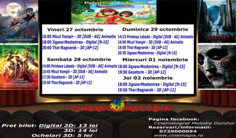 Filme de acţiune, animaţie, actiune dar şi thriller, este oferta cu care Cinematograful Melodia vine în această săptămână. Biletele pot fi rezervate la numărul de telefon: 0729.000.094.