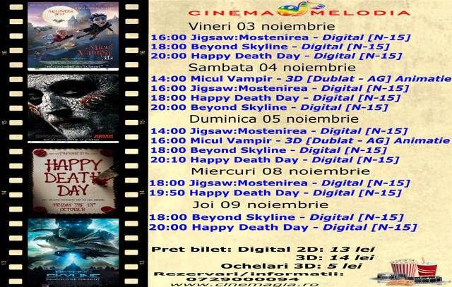Filme de acţiune, animaţie, actiune dar şi thriller, este oferta cu care Cinematograful Melodia vine în această săptămână. Biletele pot fi rezervate la numărul de telefon: 0729.000.094.