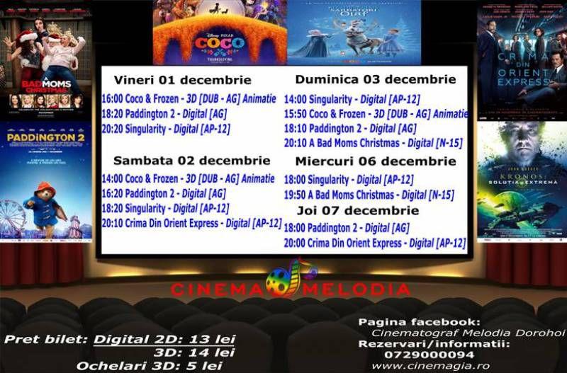 Filme de acţiune, animaţie, actiune dar şi thriller, este oferta cu care Cinematograful Melodia vine în această săptămână. Biletele pot fi rezervate la numărul de telefon: 0729.000.094.