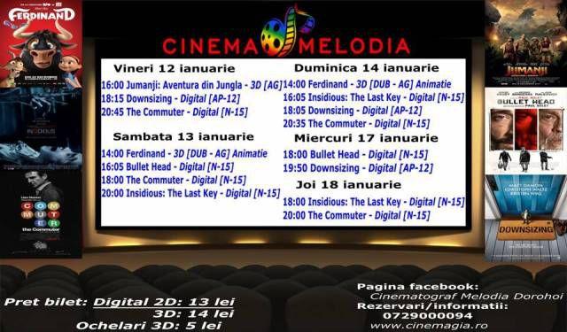 Filme de acţiune, animaţie, actiune dar şi thriller, este oferta cu care Cinematograful Melodia vine în această săptămână. Biletele pot fi rezervate la numărul de telefon: 0729.000.094.