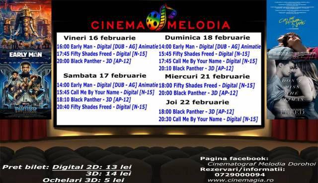 Filme de acţiune, animaţie, actiune dar şi thriller, este oferta cu care Cinematograful Melodia vine în această săptămână. Biletele pot fi rezervate la numărul de telefon: 0729.000.094.