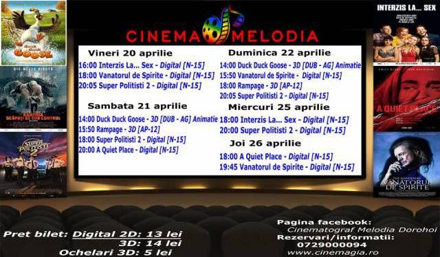 Filme de acţiune, animaţie, actiune dar şi thriller, este oferta cu care Cinematograful Melodia vine în această săptămână. Biletele pot fi rezervate la numărul de telefon: 0729.000.094.