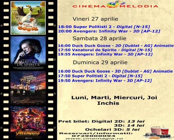 Filme de acţiune, animaţie, actiune dar şi thriller, este oferta cu care Cinematograful Melodia vine în această săptămână. Biletele pot fi rezervate la numărul de telefon: 0729.000.094.
