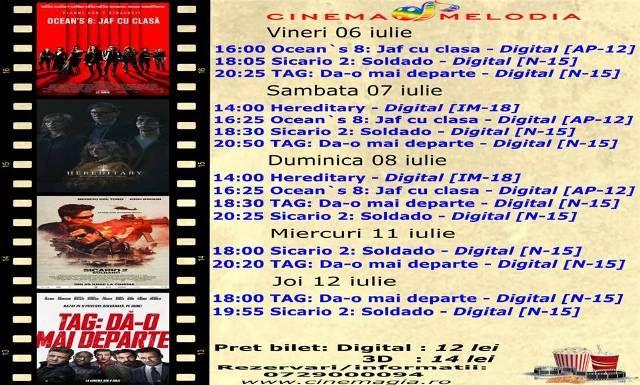 Filme de acţiune, animaţie, actiune dar şi thriller, este oferta cu care Cinematograful Melodia vine în această săptămână. Biletele pot fi rezervate la numărul de telefon: 0729.000.094.