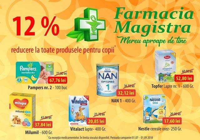 Farmaciile Magistra desfășoară o campanie promoțională în perioada 1 IULIE – 1 SEPTEMBRIE 2018, respectiv 12% reducere la toate produsele pentru copii. Produsele sunt din gamele PAMPERS, NESTLE, TOPFER, VITALACT, MILUPA și altele. Aceste reduceri se aplică în perioada campaniei, în limita stocului disponibil.