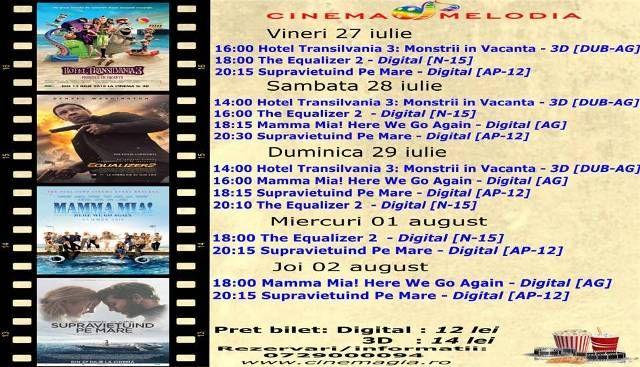 Filme de acţiune, animaţie, actiune dar şi thriller, este oferta cu care Cinematograful Melodia vine în această săptămână. Biletele pot fi rezervate la numărul de telefon: 0729.000.094.