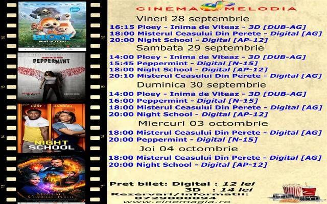 Filme de acţiune, animaţie, actiune dar şi thriller, este oferta cu care Cinematograful Melodia vine în această săptămână. Biletele pot fi rezervate la numărul de telefon: 0729.000.094.