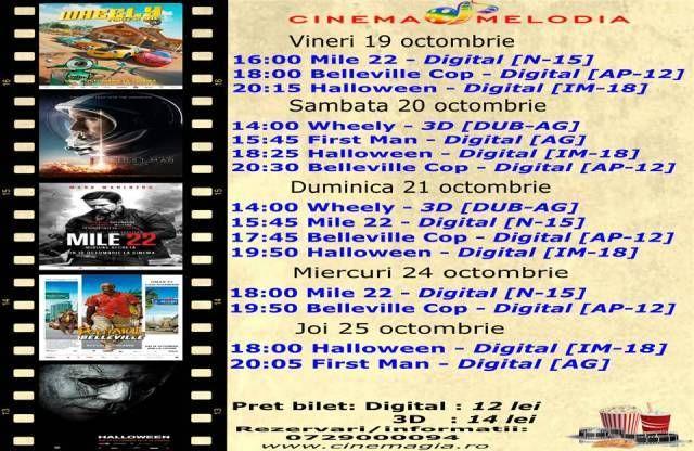Filme de acţiune, animaţie, actiune dar şi thriller, este oferta cu care Cinematograful Melodia vine în această săptămână. Biletele pot fi rezervate la numărul de telefon: 0729.000.094.