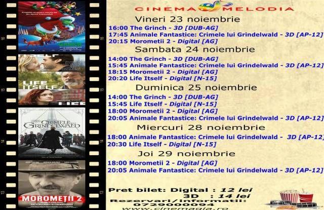 Filme de acţiune, animaţie, actiune dar şi thriller, este oferta cu care Cinematograful Melodia vine în această săptămână. Biletele pot fi rezervate la numărul de telefon: 0729.000.094.