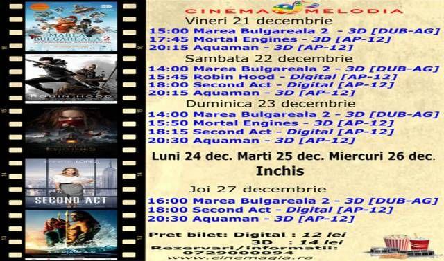 Filme de acţiune, animaţie, actiune dar şi thriller, este oferta cu care Cinematograful Melodia vine în această săptămână. Biletele pot fi rezervate la numărul de telefon: 0729.000.094.