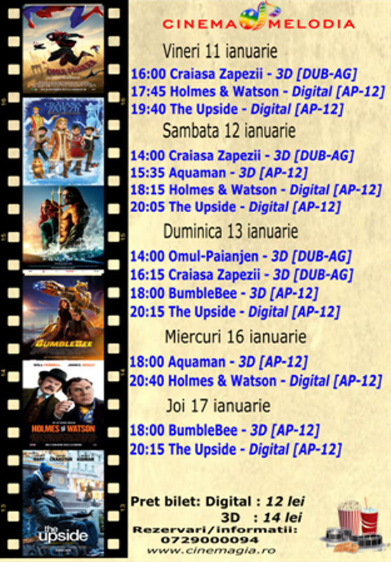 Filme de acţiune, animaţie, actiune dar şi thriller, este oferta cu care Cinematograful Melodia vine în această săptămână. Biletele pot fi rezervate la numărul de telefon: 0729.000.094.