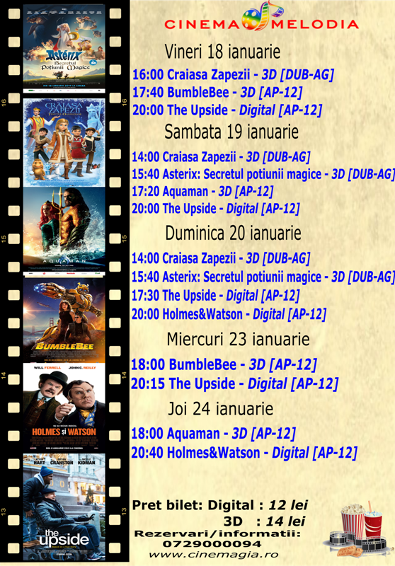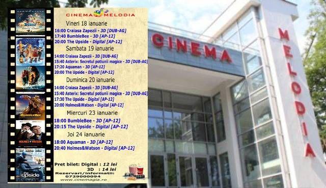 Filme de acţiune, animaţie, actiune dar şi thriller, este oferta cu care Cinematograful Melodia vine în această săptămână. Biletele pot fi rezervate la numărul de telefon: 0729.000.094.