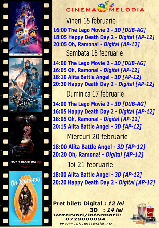 Filme de acţiune, animaţie, actiune dar şi thriller, este oferta cu care Cinematograful Melodia vine în această săptămână. Biletele pot fi rezervate la numărul de telefon: 0729.000.094.